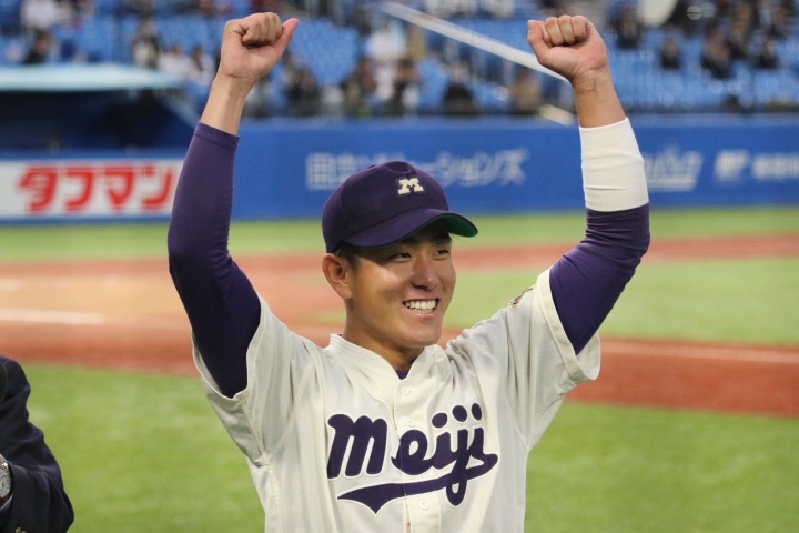 明治大学のこの秋のMVPは、主将・木本圭一(4年=桐蔭学園)だ。秋季リーグ戦ではサードとして全試合にスタメン出場し、声かけや姿勢でチームを鼓舞し続けた。ラストイヤーに掲げたスローガンは「奪冠」。3人の副将とともに覚悟を胸にチームづくりに励んできた。個性豊かな「十人十色」のこの代をまとめ上げることは決して容易ではなかったが、仲間への想い、そして1試合にかける情熱は誰よりも強かった。後輩にも積極的に声をかけ、チーム全体の雰囲気を支える存在でもあった。優勝を決めた早稲田大学との2回戦では勝利を引き寄せるタイムリーヒットを放ち、1点に貢献した。打撃に苦しんだシーズンではあったが、今季の優勝は間違いなく、木本キャプテンの強い牽引力の賜物である。チーム木本として活動できる期間を、存分に楽しんでほしい。 (加藤珠海)