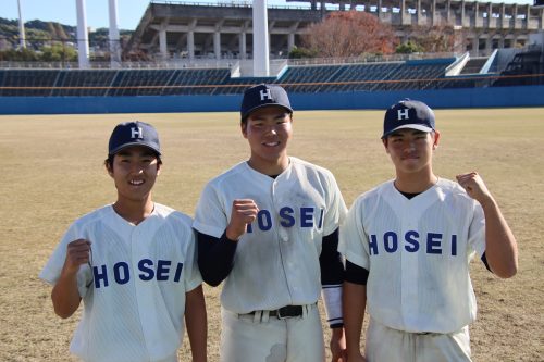 📸左から渡邉春空(1年・内野手・下妻一)、宮本芳、小倉遙恭(1年・外野手・昌平)