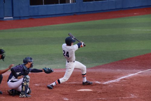 途中出場の宮本芳孝(1年・捕手・米子東)が二塁打で出塁します!その後、敵失、四球と続き満塁のチャンスを作ると、続く小川達也(1年・捕手・法政二)が走者一掃となる二塁打を放ちます!さらに相手の暴投で進塁、挟殺プレーの間に生還し、この回4点を奪います。 7-1