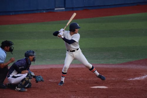 鈴木蓮太(1年・外野手・川崎市立橘)が四球で出塁し、続く星野昂大(1年・外野手・法政二)のヒットで二死1.2塁とします。そして、菊池匠太(2年・外野手・駒澤)がセンターへのタイムリーヒットを放ち、先制に成功します🙌1-0