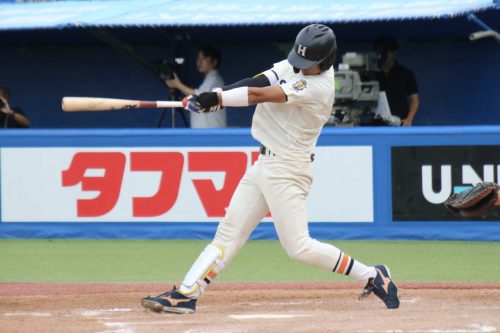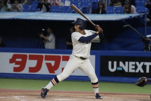 第2戦では大きくスタメンが代わり、ここまで不動の4番とされてきた松下歩叶(主将・内野手・桐蔭学園)が3番へ。そして今まで7番で起用されていた井上和が4番。春は1番で起用されていたが秋では3番を任されていた藤森康淳(3年・外野手・天理)が再び1番へ。春から起用され続けていた境亮陽(1年・外野手・大阪桐蔭)に代わり、浜岡がスタメンに顔を並べました。