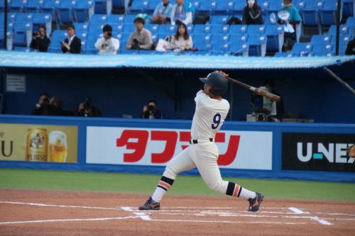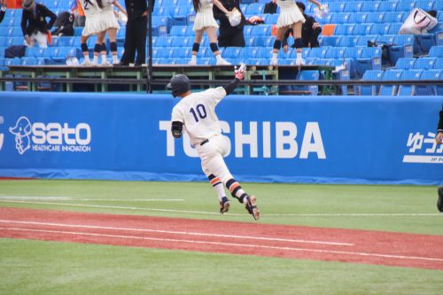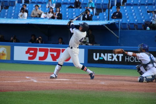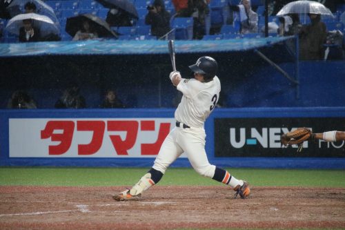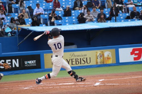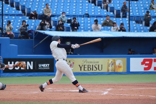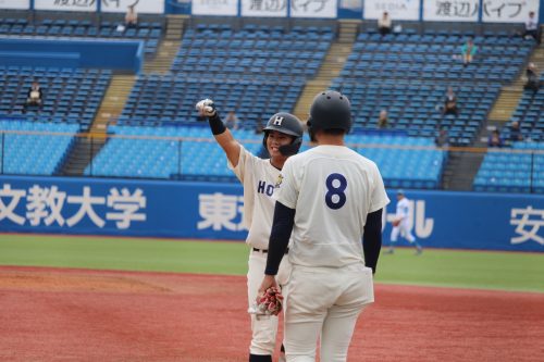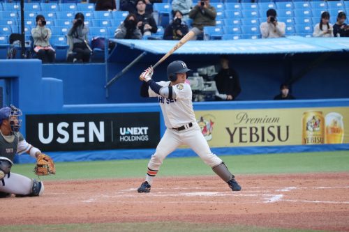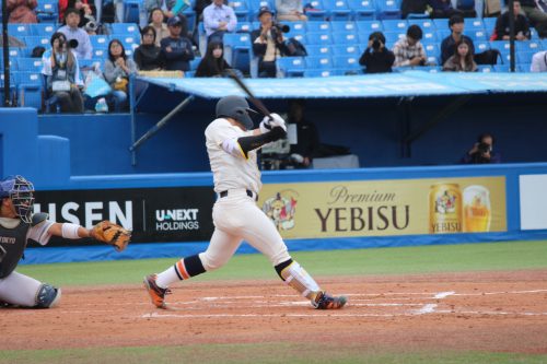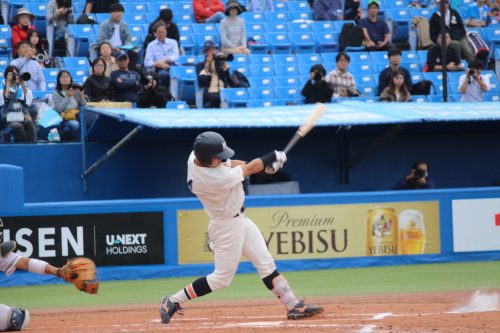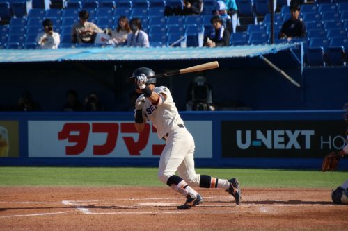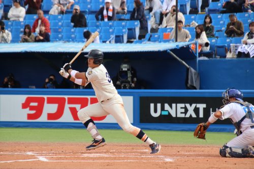 さらに代打に佐藤拓斗(4年・内野手・日大山形)が送られます。今季初のリーグ戦出場。初球を振り抜き、見事リーグ戦初ヒットを放ちます!!