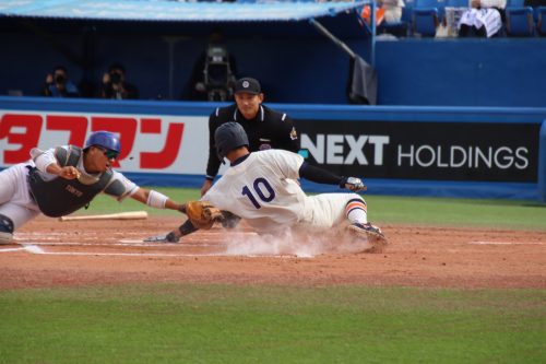 今泉秀がフォアボールを選び出塁すると井上和輝(1年・捕手・駿台甲府)がライト前ヒットを放ち1.3塁とします。その後相手のパスボールの間に今泉秀が生還。さらにリードを広げます!4-0