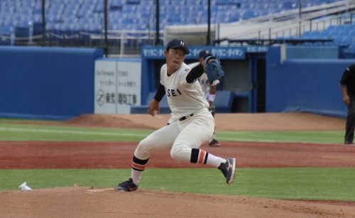 強力明大打線を7回2/3自責点1に抑え、マウンドを降ります。