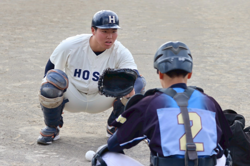 ゴロ捕球の基礎を教え、ボールを追う時に頭の位置を変えないことなど技術的な面も細かく指導する様子が見られました。