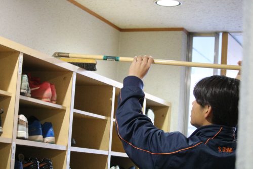 下駄箱の上を掃除する近江駿弥(新3年・投手・札幌一)