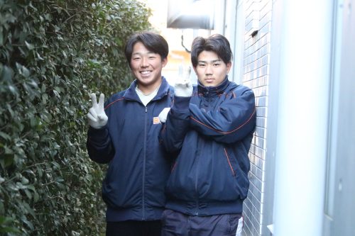 寮の周りを掃除する左:井上和樹(新2年・捕手・駿台甲府) 右:槙野遥斗(新2年・投手・須磨翔風)