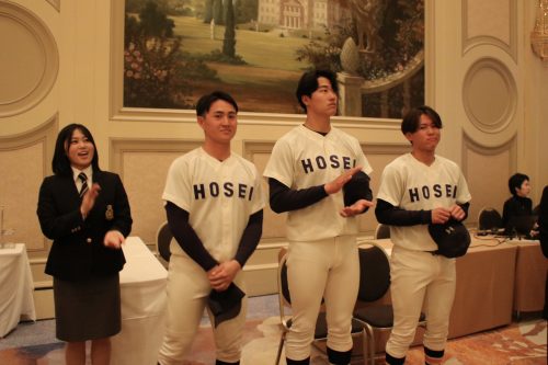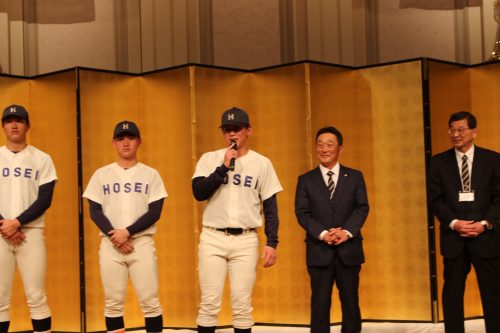 このような素晴らしい式に出席でき、日頃本当にたくさんの方々に応援していただいてるんだと改めて感じることができました。これからも歴史と伝統のある法政大学野球部の主将として、責任を持って努めてまいります。今後ともご支援、ご声援のほどよろしくお願い致します。