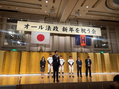 オール法政の新年を祝う会に参加でき、とても良い経験ができました。普段より神宮で自分たちが背負っている法政ブランドを自分たちの手で優勝という結果をもって上げられるように今後精進していこうと思いました。今後ともご支援、ご声援のほどよろしくお願いいたします。
