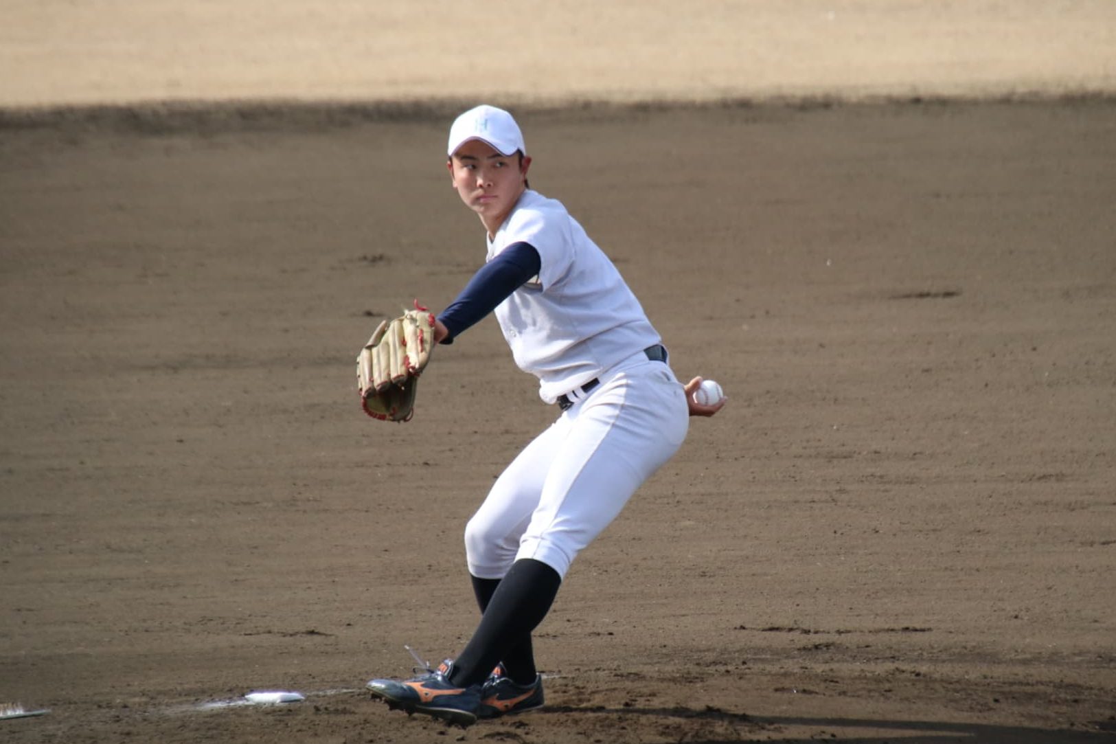 ➡️肌寒く感じる中でもノースリーブでスライディング練習をする熊谷陸(新3年・内野手・花巻東)🧤