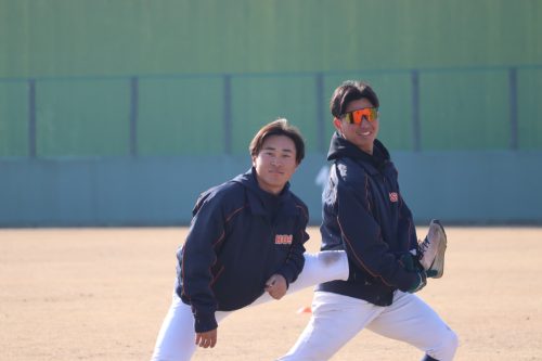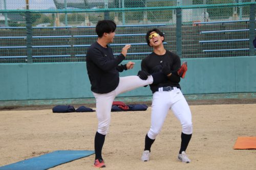 ➡️ストレッチ中も笑いが絶えない山床志郎(新3年・投手・高鍋)& 中村騎士(新3年・内野手・東邦)の新3年生コンビ💙