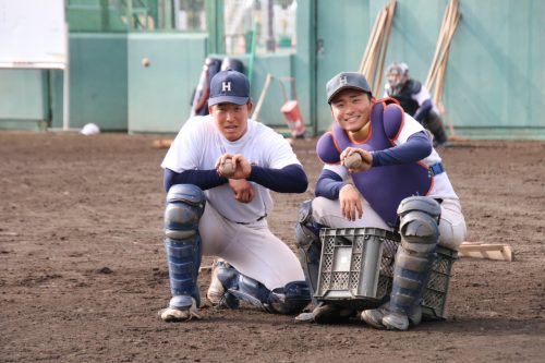 ➡️自主練習終わりの西凌矢(新4年・外野手・広陵)、奥田知朗(新4年・捕手・国士舘)