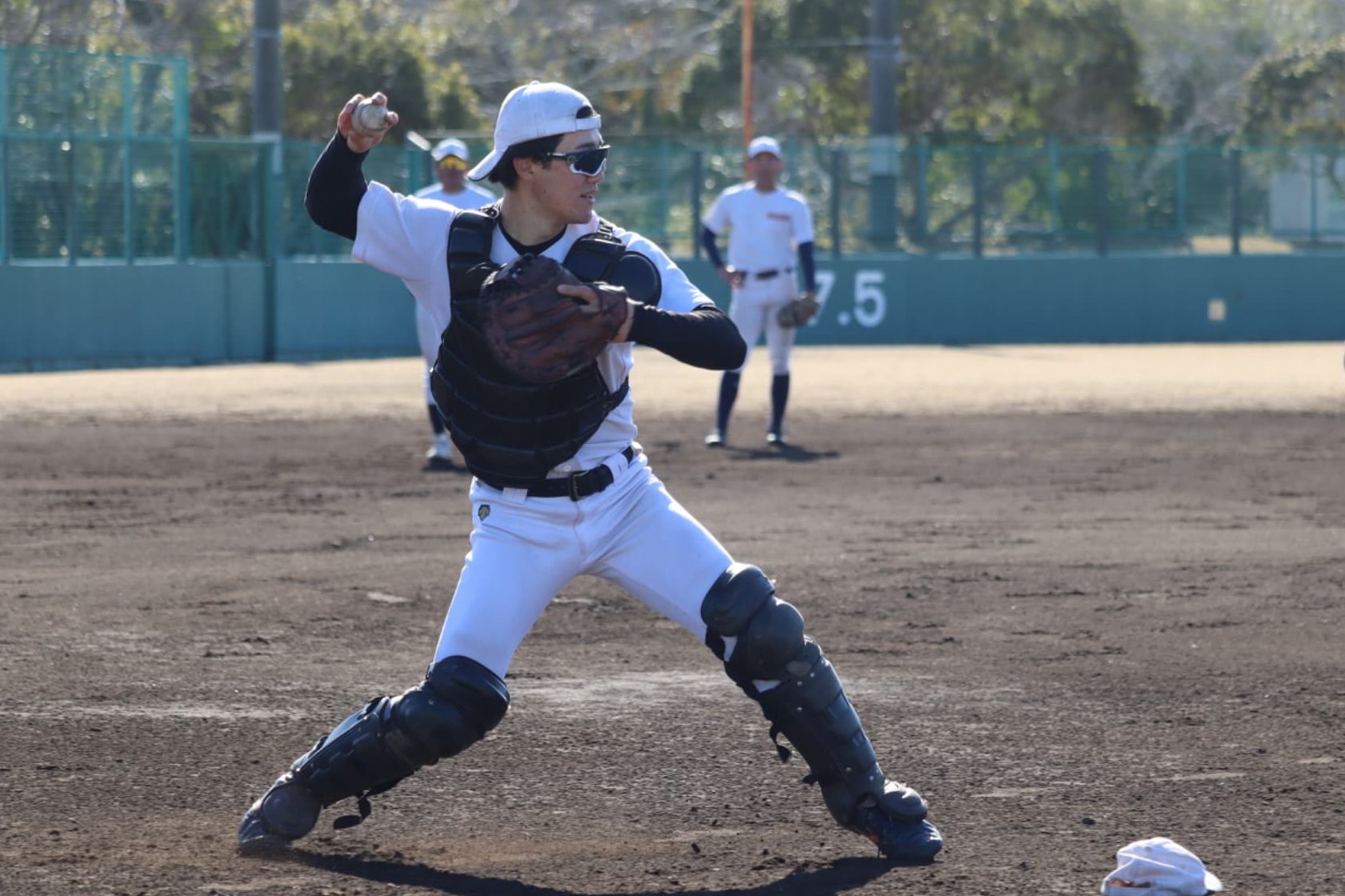 ➡️送球練習をする川崎広翔(新4年・捕手・日大三)