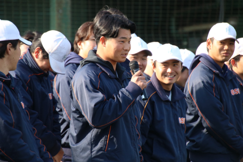 開校式では、大島監督・法友野球俱楽部和田副会長よりご挨拶をいただいた後、各チームのリーダーから自己紹介を行いました。