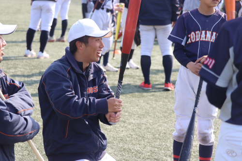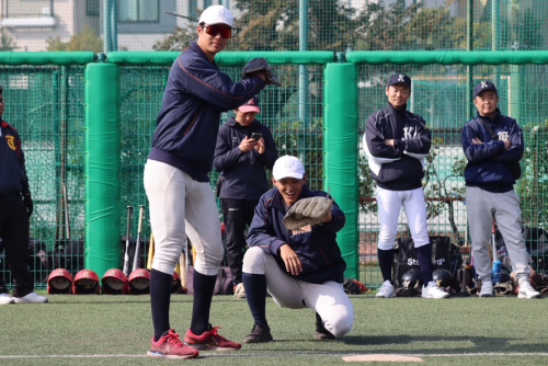 普段はピッチャーの上野 優太(新4年・投手・法政二)も野手に負けじと明るく教えます✨