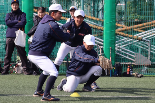 学生コーチの豊田主導のもと、キャッチボールの時間に質問コーナーを設けました。