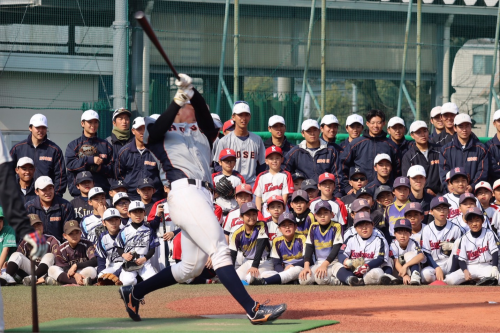 素振り指導では、「バットをセンターに投げるイメージで!」など、小学生のみんなにも分かるように具体的に伝える様子が見られました👀