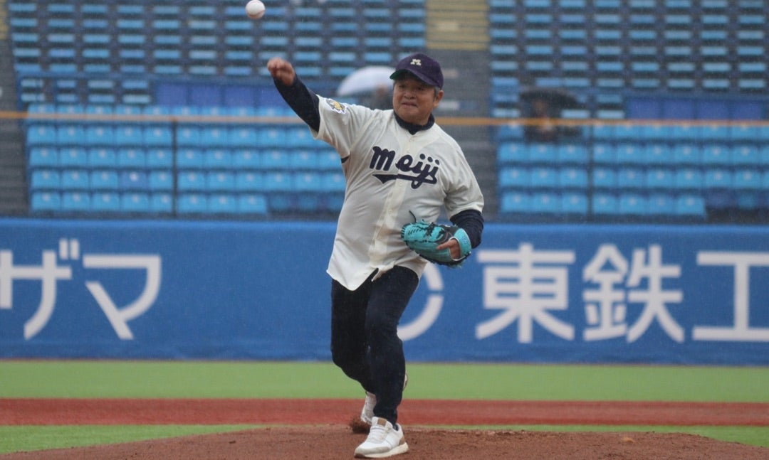 試合に先立ち、本日は弊部OB・武田一浩さん(S63卒)に始球式を行っていただきました。