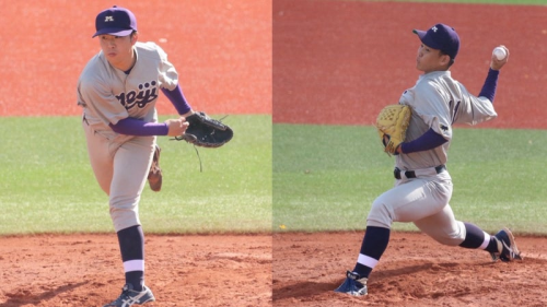写真:リリーフ登板した左から2年・三瓶(仙台一)長谷川獅(明治)