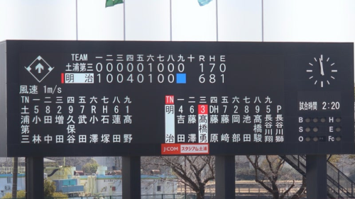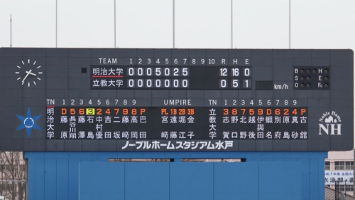 6回裏、7回裏と続いて三瓶、巴田が無失点で抑え、大会規定により7回打ち切りで試合終了。明治打線の畳みかけるような攻撃で相手を寄せ付けず、大差で勝利を収めることができました!🐗