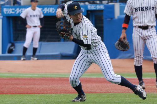 4回表、立大先発 南陽人(1年・投手・大阪桐蔭) は連打と四球で一死満塁の危機を背負うと、内野ゴロと適時打で2点を失い逆転を許します。