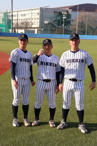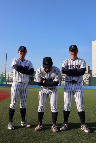 青空の下、とっっっても素敵な笑顔を見せてくれた主将 落合智哉(4年・捕手・東邦)と副将 斎藤蓉(4年・投手・仙台育英)&丸山一喜(4年・内野手・大阪桐蔭)の3人が目印です🌞