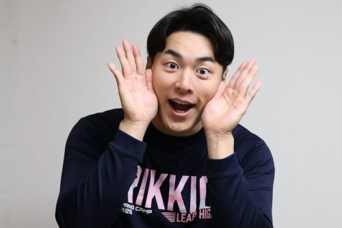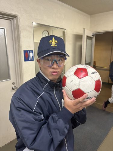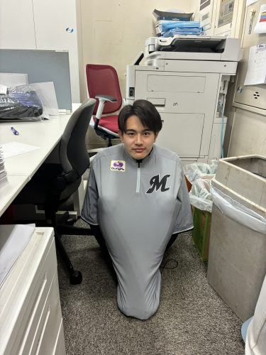 ウェアが大きすぎてダンゴムシ状態になるバラエティ豊かな宇畑直斗(4年・マネージャー・立教新座)