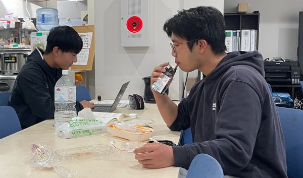 【寮のロビーでご飯を食べる武田投手と勉強する深見捕手】