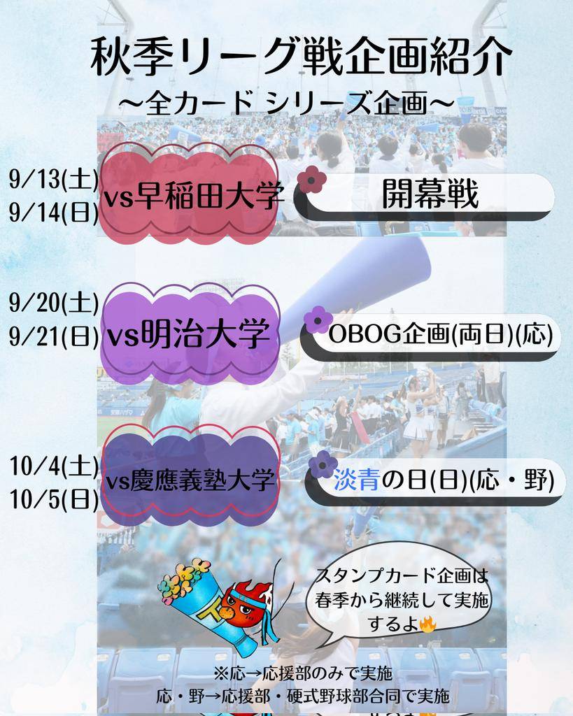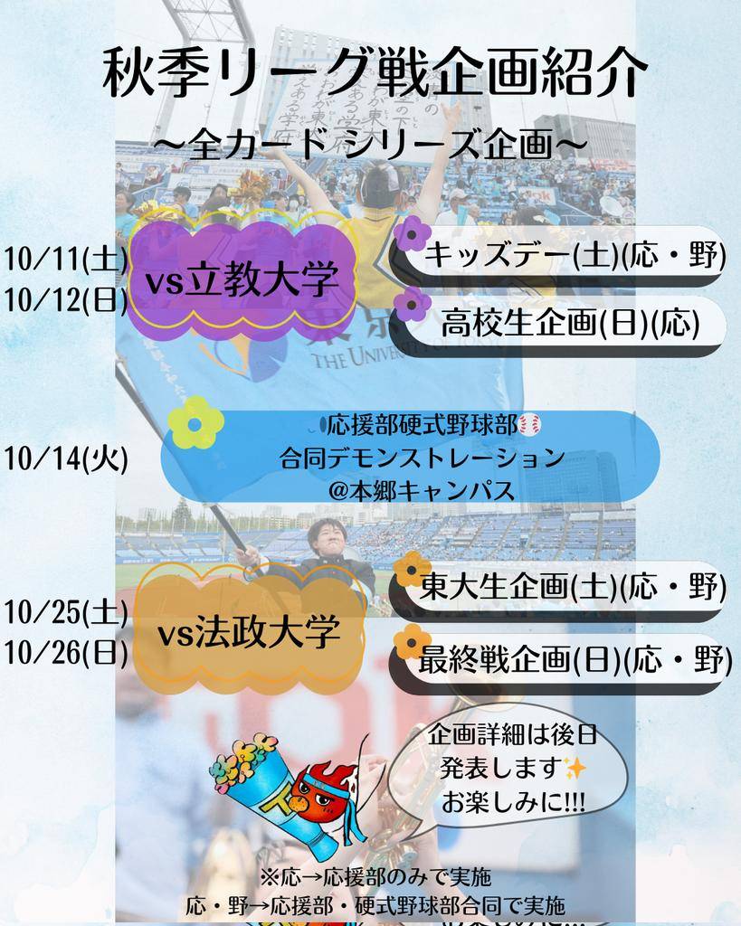これまで東大野球部を支えてくださったお客様への感謝の気持ちを込めて、10/26に最終戦企画を実施します。当日は応援席にてサイン入りメガホンの配布や試合前に特別なチャンスパターンメドレーを行います✨
