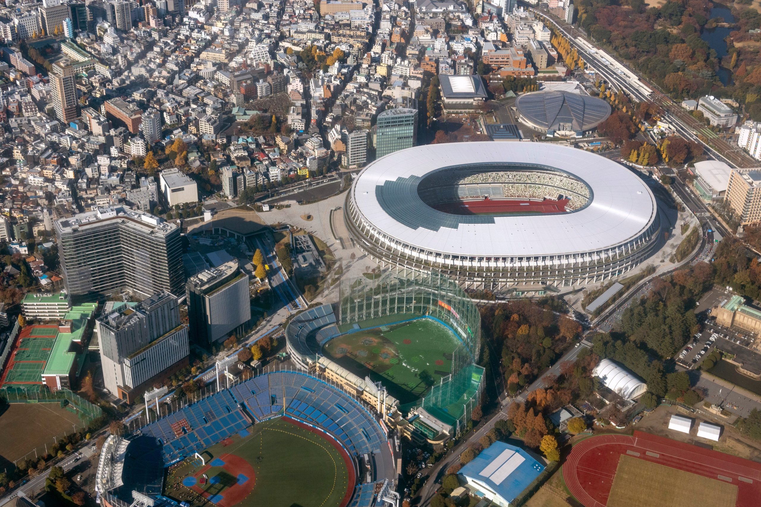 [左下が神宮球場。世界陸上が行われた国立競技場のすぐそばです。]