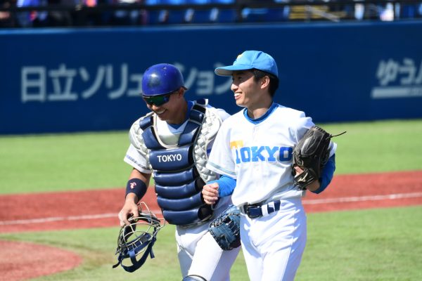 次の法政のカードでは、渡辺(4年/投手/海城)が完投して二勝目を挙げられましたが、この試合は本当にしんどくて、サヨナラ勝ちでホームインした瞬間は涙が止まりませんでした。慶應戦とは真逆で、ずっと法政に押されている中でのサヨナラ勝ち。終始しんどかったけれどもそれを跳ね返した経験のおかげで、神宮の場で常に心の波風を立たせず冷静にプレーできるようになれたと思います。法政にも結局勝ち点は取れませんでしたが、二回も、勝ち点のかかった第三戦を戦えた経験は必ず最終カードにつながると思っていました。
