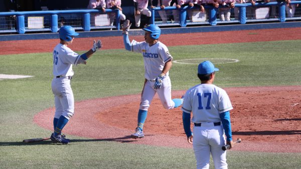 ▲【ホーム生還後、長谷川内野手とハイタッチする小田内野手。試合直前に平松アナリストが苦しんでいた大学の課題を秒で解決し、試合中もヒットを放つという文武両道っぷりを発揮】