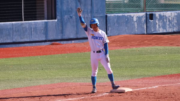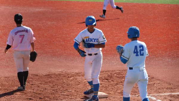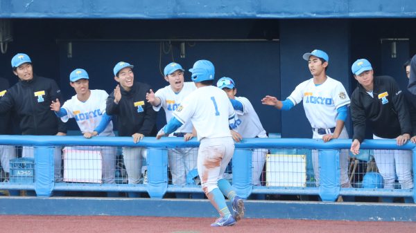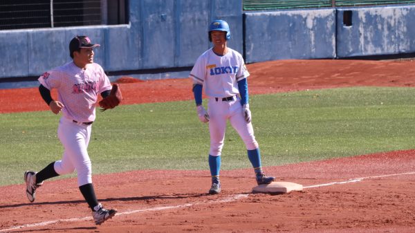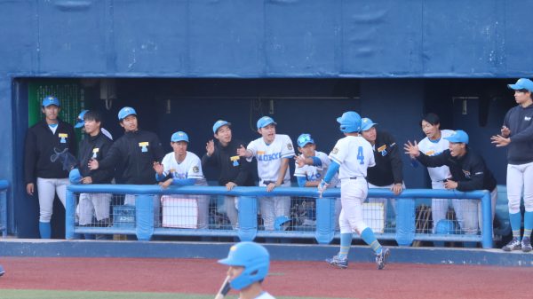 7回表、先頭の横井内野手(2年/市立向陽)がヒットで出塁、その後盗塁を決め、さらに大沼亜斗夢内野手(1年/日比谷)のタイムリーヒットでホームイン!1点追加!この時得点は9-3と大きくリードしています。