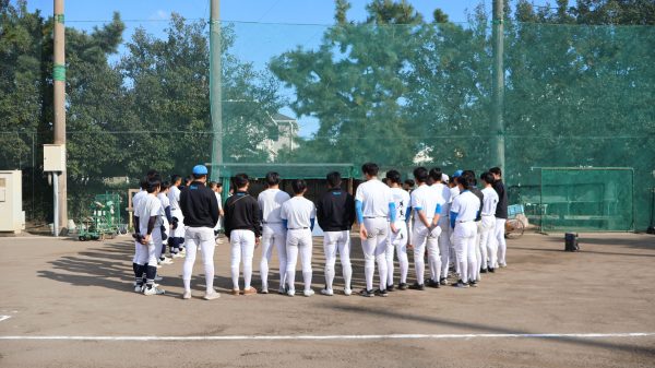▲【円陣の中はこんな感じです。挨拶をしているのは秋のフレッシュトーナメントでキャプテンを務めていた大山捕手(2年/ラ・サール)です】