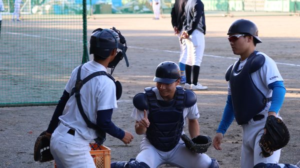 ▲【キャッチャー陣。深見捕手(2年/サレジオ学院)(中央)、大山捕手(右)】