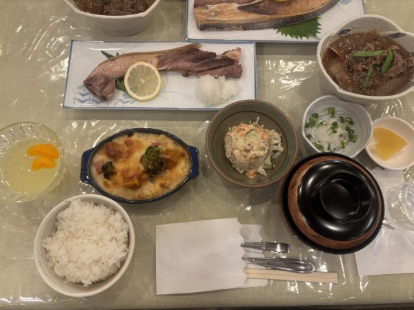 ▲【夜ごはんです。奥に写っているのは同じく球場泊を選んだひらしほこと平松アナリスト(2年/洛南)】