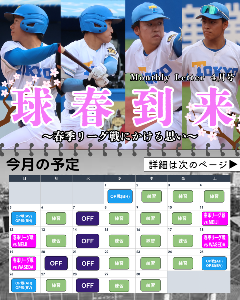早いもので学生野球も最後の1年を迎えました。入学してから5度勝ち点獲得に挑む機会がありましたが、いずれも他大学の高い壁に阻まれてきました。その悔しさを胸に、今年こそは勝ち点獲得、そして「勝撃」をという思いで冬の間鍛錬を重ねました。一冬越えて成長した東大野球部の姿をぜひ神宮球場でご覧ください。春も変わらぬご声援のほどよろしくお願いいたします。