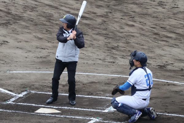 (打席に立つ水戸市長。大山捕手(3年/ラ・サール)と写真には写っていませんが福井投手(2年/開成)が相手を務めました)