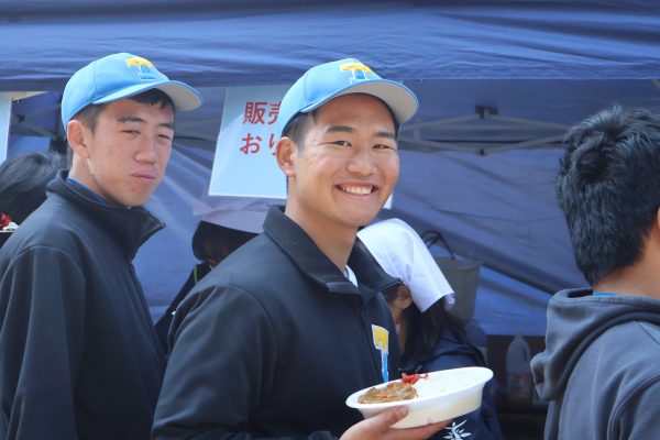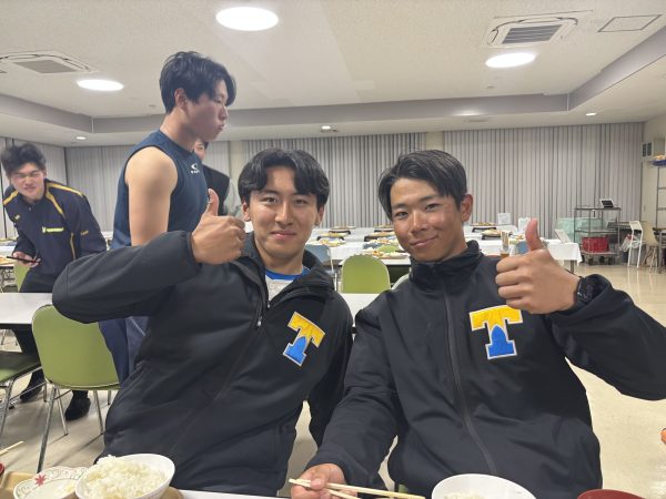 (カレーを片手に満面の笑みを浮かべる富田投手(2年/麻布)と珍しくピースをしていない土ヶ端学生コーチ(3年/城北))