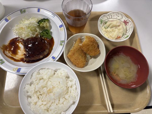 (1日目の夕食はハンバーグでした!写真を撮らねばならないことを途中で思い出したので食べかけです)