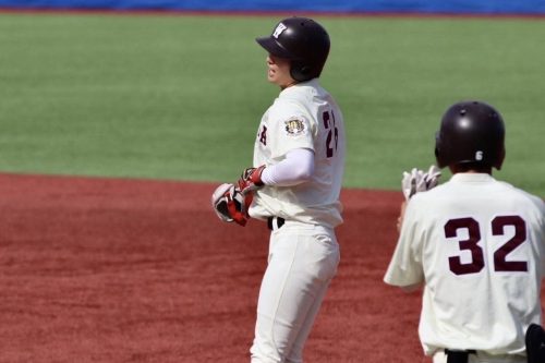 こうしてたくさんの人に支えられて、立教戦で初ヒットを打つことができました。一塁ベース上からベンチを見ると、自分のヒットを本気で喜んでくれる仲間がいて、スタンドからは大きな歓声が聞こえました。ブルペンに向かい、スタンドにいる同期や後輩みんなに声をかけられている際に、中島(中島稜太・4年・学コ・人間・桐朋)と目が合った時は泣きそうで危なかったです。この野球部でこのメンバーと出会えて一緒に野球ができて本当に良かったと心から思いました。