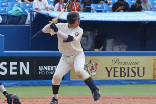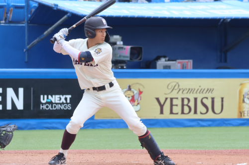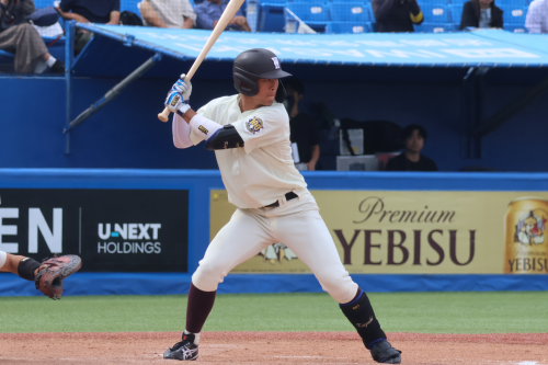 1回裏、守備の乱れと安打で2点を先制される苦しい立ち上がりとなります。しかし、4回表、前田健伸(4年・内・商・大阪桐蔭)、田村の連打でチャンスを作ると、石郷岡のゴロの間に1点、さらに、吉田瑞の適時二塁打で同点に追いつきます。その後も打線がつながり、尾瀬雄大(4年・外・スポ・帝京)、渋谷の連打で5-2と勝ち越しに成功します。
