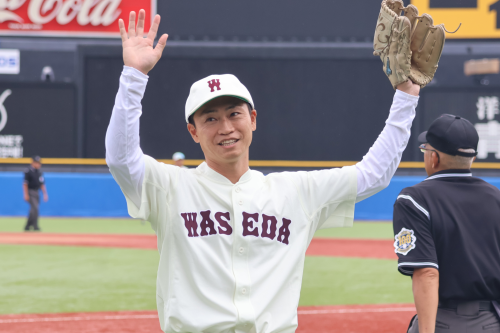 この日の神宮球場では、OBの青木宣親さん(H16卒)による始球式が行われ、青木さんの投球に、観客からは大きな拍手と歓声が起こりました。
