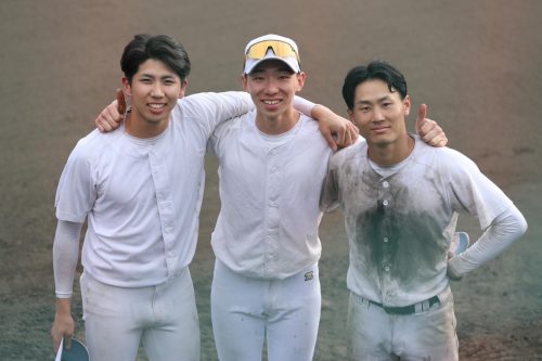そんな時にターニングポイントとなったのは、3年生の夏頃です。セカンドからショートにポジションを変更しました。1からということもあり、自分の中で覚悟が決まりました。しかし、ショートを守るのは大変苦労しましたし、悩むことも多かったです。なぜ思ったところに投げられないのか、本気で悩みました。みんなができできてなぜ自分はできないんだろうと、何度も思い詰めました。でも、できないなら量をやるしかなかったみたいで、結局はどれだけやったかが自信になり、その自信がプレーを後押ししてくれました。監督、コーチ、先輩、同期、時には後輩まで、多くの人にアドバイスをもらいました。ご指導くださった方々、ありがとうございました。少しは成長したと思います。また、ショートのポジションを守るにあたって、オフでもノックに誘ってくれて、やる気に火をつけてくれた大西(大西創志・4年・学コ・人間・城北)には感謝しています。ありがとう。そして、こちらから何度もお願いして、長い時間自主練習に付き合ってくれた中島(中島稜太・4年・学コ・人間・桐朋)、畑﨑にも感謝の気持ちでいっぱいです。本当にありがとう。