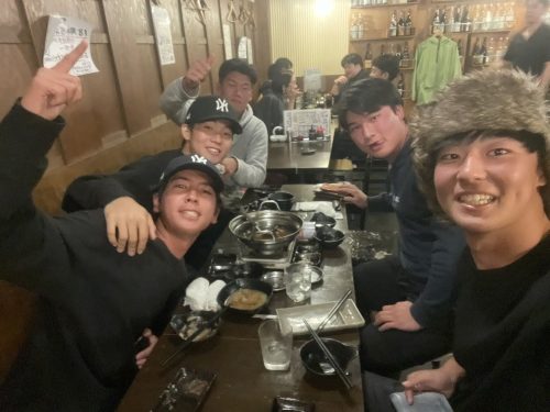 最近、引退が近づいてきて涙腺がおかしくなってきています。この間もカラオケに行った時に、ケツメイシの「友よ」という曲をみんなで歌ったのですが、気づいたら号泣していました。その時、裕平(伊藤裕平・4年・投・人間・水沢)と力樹(山口力樹・4年・内・スポ・早稲田佐賀)は泣いている自分の顔見て、爆笑していました。彼らには人の心があるのでしょうか。ただ、そこで笑ってくれるのも2人の良いところだと思います。115期みんな良い人で大好きです。同期といつまでも一緒にいたいなと本気で思います。