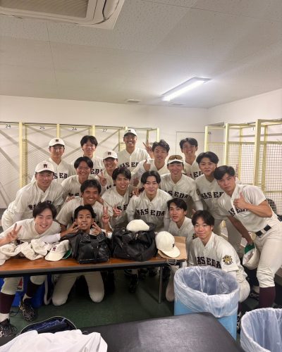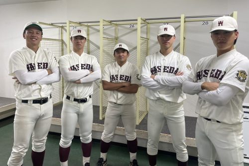 外野陣(片岡(片岡孝介・3年・外・社会・早大本庄)・豊田(豊田高輔・3年・外・商・早大学院)・永谷(永谷天太・3年・外・教育・早稲田実)・長渡(長渡笙・3年・外・スポ・早稲田佐賀)・細谷(細谷俊輔・3年・外・教育・早稲田実))へ