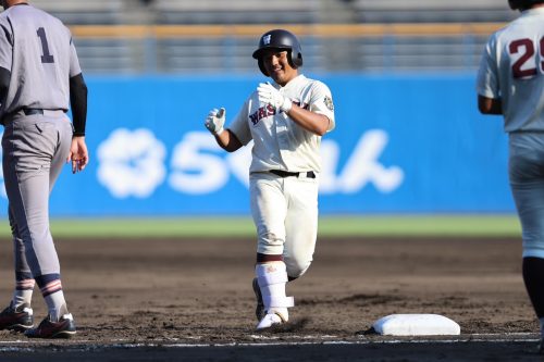 翌日、坊っちゃんスタジアムで愛媛大会を迎え「8番・指名打者」で起用していただきました。結果を残したい。その思いと同じくらい、夏の東伏見キャンプでやってきたことが間違いではなかったと証明したかったです。南魚沼キャンプに行けなかった悔しさを全員が抱え、「神宮で活躍する」という目標に向かって東伏見で練習に取り組んできました。勿論、技術や精神力が足りないのは事実です。それでも目標を見失わず、自分が神宮に立つことをイメージして全員がやってきました。そのキャンプを経て、私はWASEDAのユニフォームを着て、慶應と戦う機会を頂きました。私が活躍すれば、やってきたことが決して間違いではなかったことが証明できる。Bチームとしての強さを証明できる。一緒に頑張ってきた皆を少しでも勇気づけたい。この思いで打席へ向かいました。打席へ入る前のかおり(成瀬かおり・4年・マネ・スポ・千種)のアナウンス、スタンドからは4年間歌い続けたコンバットマーチ。噛み締めるように打席へ入りました。結果はサード後方へのタイムリー。その瞬間の歓声や紺碧の空。ベンチを見れば皆が喜んでくれている。野球人生最高の瞬間でした。