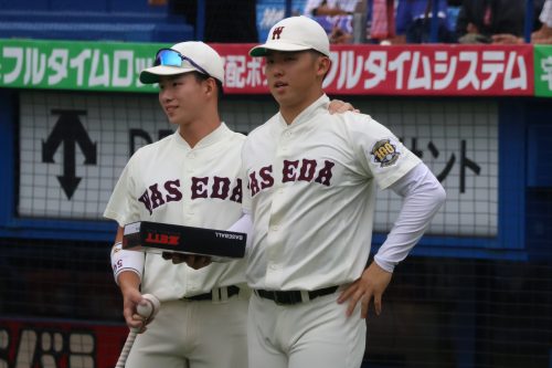 写真左から 大西創志(4年・学コ・人間・城北)、越井颯一郎(3年・投・スポ・木更津総合)
