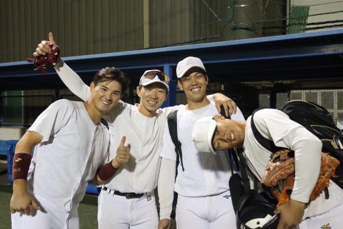 選手を上がって、ノック打ってくれたりチームのために動いてくれてありがとう。春の優勝もみんなのおかげです。ちから(飯島周良・4年・教育・早大本庄)は学生トレーナーだけどキャッチャーフライの練習にも付き合ってくれる優しいやつです。試合前日はキャッチャーフライを練習するのがルーティーンになりました。最近は監督も打ってくれるようになりかなり上手くなりました。川内さんを呼ばずにすんで良かったです。