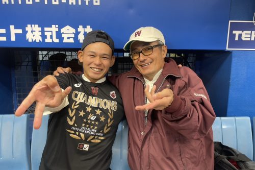 あと、新チームが始まったときに、監督から「秋の早慶戦後、どんな自分を想像しているか」をレポートにまとめて提出しろという課題が出たのを覚えているかな?その時、俺は「同期のみんなから、何だかんだ主将がお前でよかったと言われている」と書いて提出しました。本当に俺が主将で良かったのかな?早慶戦に勝ったあと、ぜひ教えてほしい。